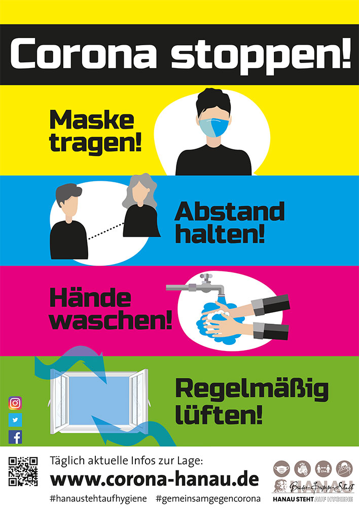 corona@hanau.de zu erreichen. Plakate und Broschüren (in sieben Sprachen) der Aktion „Corona Stoppen“ können beim Hygieneteambezogen werden